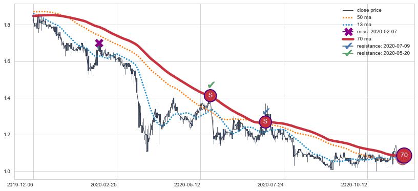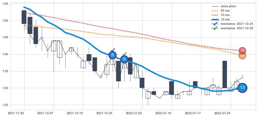 下跌趋势2021-11-30-2022-01-26,均线13确认关键阻力2处
