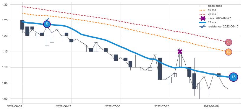 下跌趋势2022-06-02-2022-08-12,均线13确认关键阻力1处