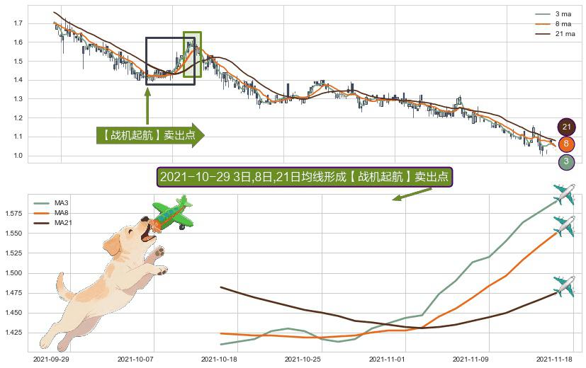 形态多维评估: ⚀ 2021-10-15日-2021-11-15日显现 3日-8日-21日均线 【战机起航】卖出点 看空信号,后市看跌,卖出