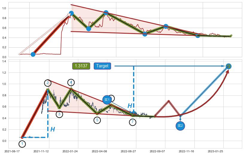 ➣ D点拟合预测价格0.5418,距离最后交易收盘价格0.42500相差 +27.49%