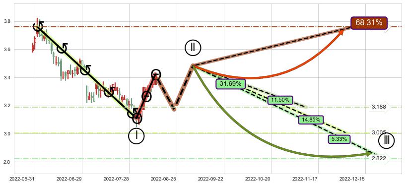 ➣ 循环浪继续向下【平均值】位置(2022-12-05, 3.005),匹配聚类样本比例46.87%, 可能性概率14.85%