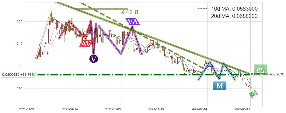 ♘ 在最后的下跌阶段2021-02-24至2022-08-12,存在 持续未破位的阻力位 ,阻力价格0.0807368,可信任强度86.29%,其距离最后价格0.0480000相差 +68.20%