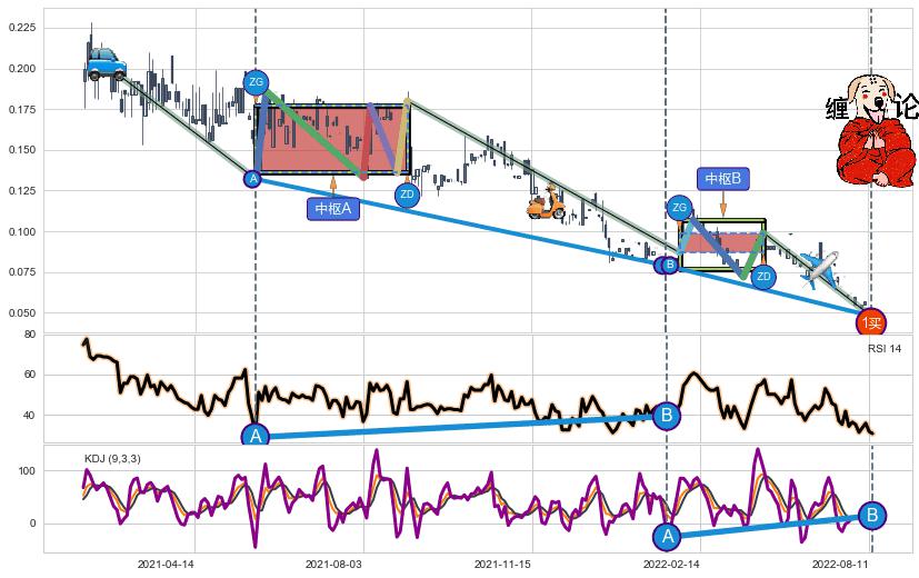 ➣ 【中枢B】:2022-02-04-2022-04-22,中枢由4笔构成,共26交易日, ZG=0.0990000, ZD=0.0870000