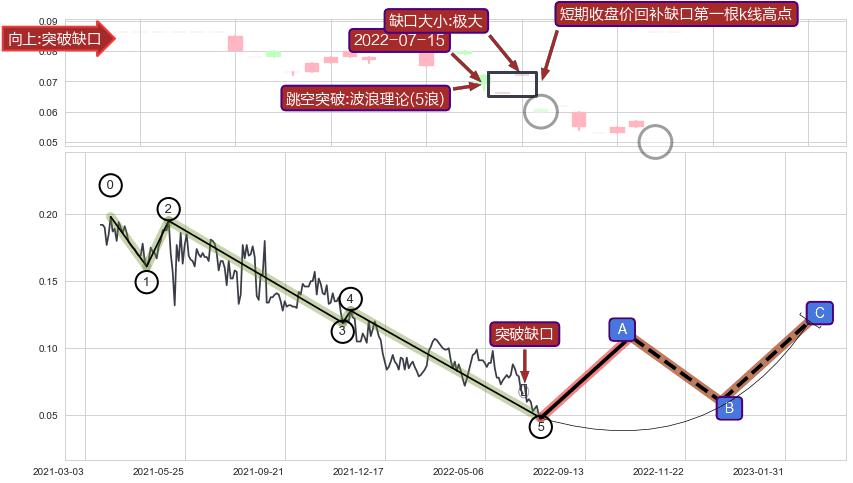➢ 突破缺口形成后,后续k已经超过7根,跳空突破波浪理论(5浪)关键点后, 出现【完全回踩】迹象,短期收盘价回补缺口第一根k线高点