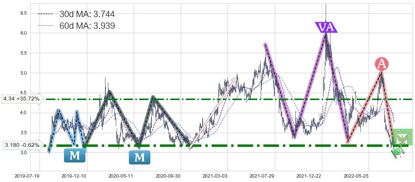 ♘ 阻力价格位4.34,可信任强度56.86%,距离最后交易2022-08-12形成的收盘价格3.200相差 +35.72%