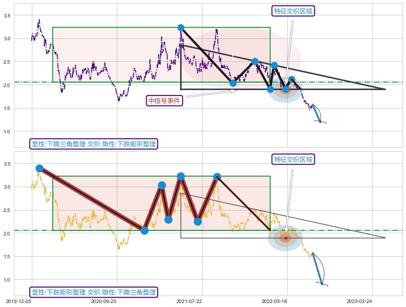 | 2 🅚:【死亡谷】卖出点 ➕ 📐:下降三角整理下行突破支撑位破位, 猜想持续下沉下跌,被突破的支撑位已变为阻力位 ☞ 看空信号 ⇥ 【均线】交织【图形】⇥ 综合量化分数: 31 | > |