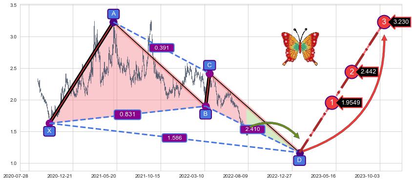 ➣ 未完成【蝴蝶】形态起点X: 2020-10-05, 已到达C点: 2022-03-28, 预测最终D点: 2023-01-19, 共564交易日