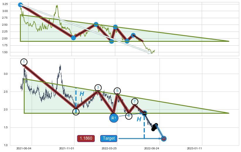 ➢ 【多方力量耗尽,空方打破攻守平衡点】下降三角形中继整理, 已在2022-07-05突破【支撑】颈线 1.9000 →演变成下降通道
