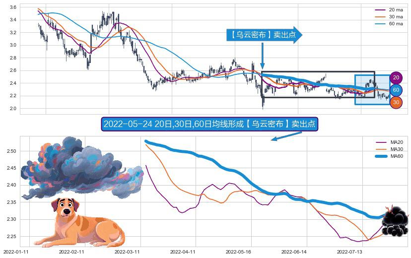 ⚀ 2022-03-15日-2022-07-27日显现 20日-30日-60日均线 【乌云密布】卖出点 看空信号,后市看跌,卖出