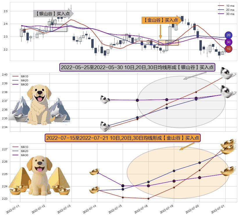 ⚃ 2022-07-18-日至2022-07-21-日显现 10日-20日-30日均线 【金山谷】买入点 其再次确认了买入信号,可靠性更强,买入