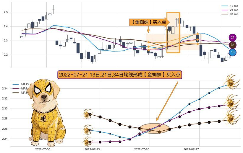 ⚀ 2022-07-21日显现 13日-21日-34日均线 【金蜘蛛】买入点 看多信号,后市看涨,买入