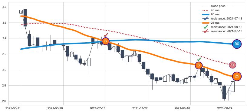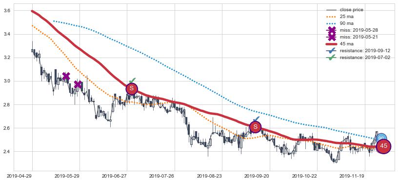 ⚄ 价格在均线遇到阻力后已再次向下回落了【较长】距离, 第⑦卖出点 阻力效果得到【初步确认】