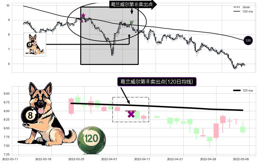 形态多维评估: ⚀ 2022-04-06-日显现 葛兰威尔均线 120日均线 第⑧卖出点 下降趋势的中继信号,后市看跌,卖出信号