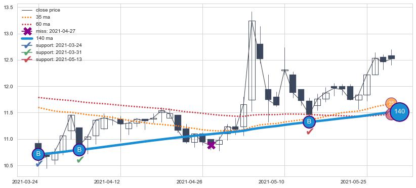 上涨趋势2021-03-10-2021-05-28,均线140确认关键支撑3处