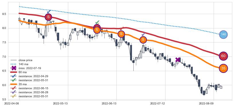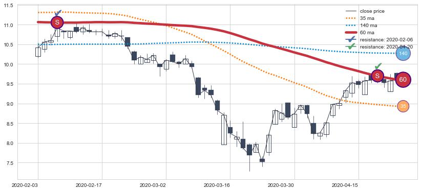下跌趋势2022-04-08-2022-08-12,均线35, 60确认关键阻力4处
