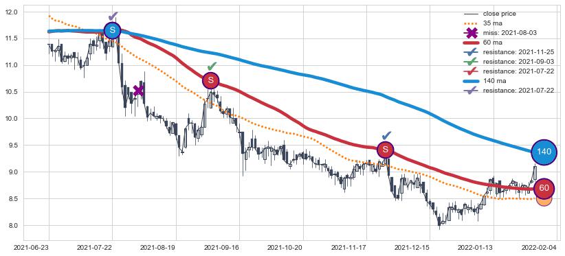 下跌趋势2021-06-23-2022-02-04,均线140, 60确认关键阻力3处