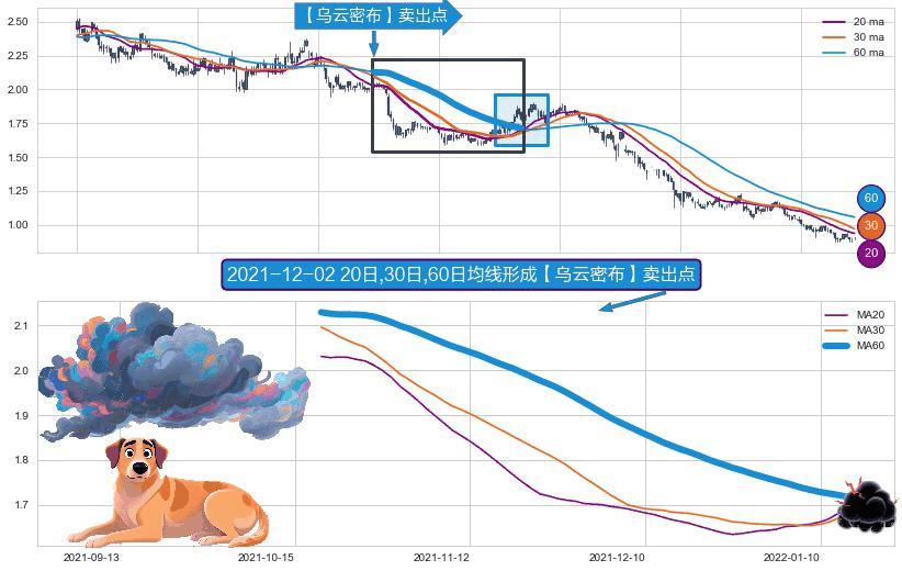 ⚀ 2021-10-20日-2022-01-14日显现 20日-30日-60日均线 【乌云密布】卖出点 看空信号,后市看跌,卖出