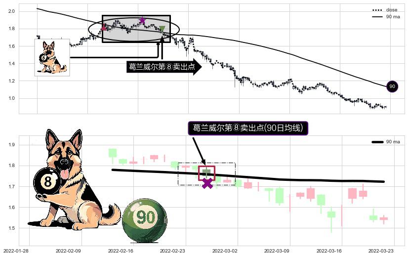 ⚀ 2022-02-25-日显现 葛兰威尔均线 90日均线 第⑧卖出点 下降趋势的中继信号,后市看跌,卖出信号