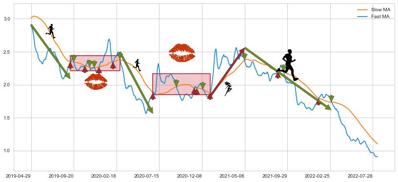 ⚂ 【死亡谷】卖出点长时间对 牛 市转 熊 市进行确认,且均线压制价格走势,但信号发出时间较长,属于【迟滞】看空卖出信号