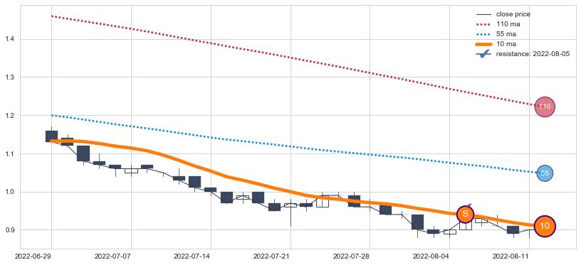 ⚂ 第⑦卖出点 刚刚再次反弹均线向下回落, 阻力 效果并未十分稳固,属于【激进】的卖出信号,高时效看空信号