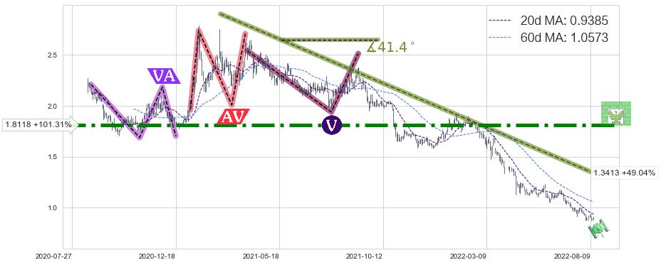 从2021-02-23至2022-08-12,共包含361个交易日,阶段股价下跌-92.97%,阶段股价变动位移路程比: 1 : 6,下跌趋势角度: 41.4
