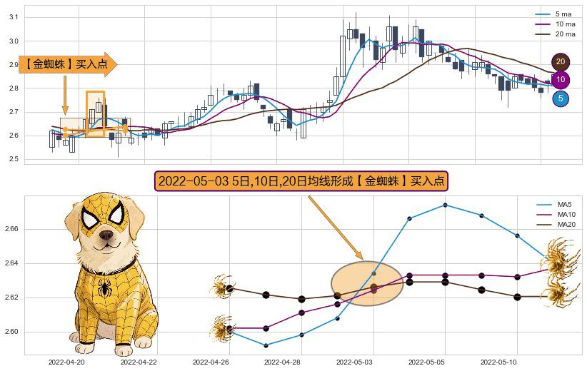 ⚀ 2022-05-03日显现 5日-10日-20日均线 【金蜘蛛】买入点 看多信号,后市看涨,买入