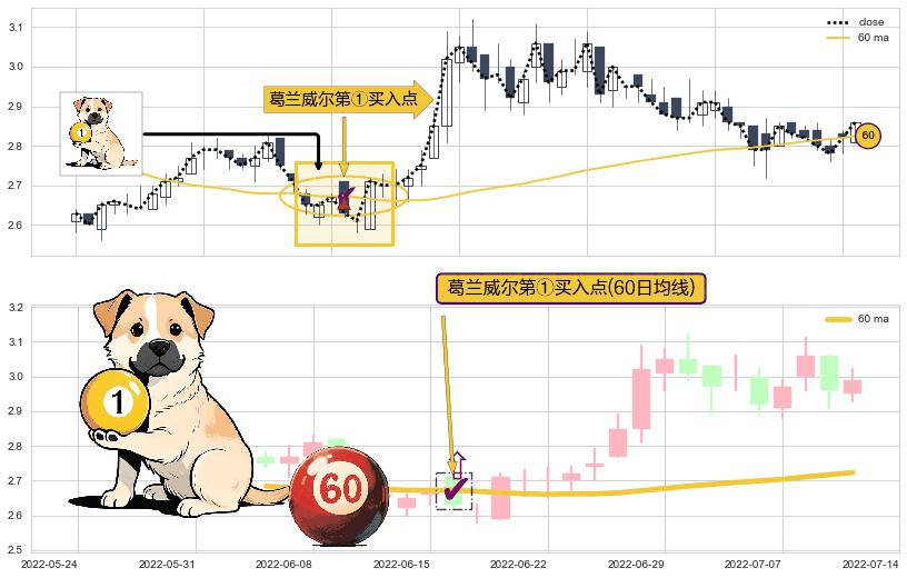 ⚀ 2022-06-16-日显现 葛兰威尔均线 60日均线 第买①入点 走势反转见底信号,后市看涨,买进信号