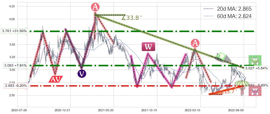 ♘ 阻力价格位3.083,可信任强度90.30%,距离最后交易2022-08-12形成的收盘价格2.860相差 +7.81%