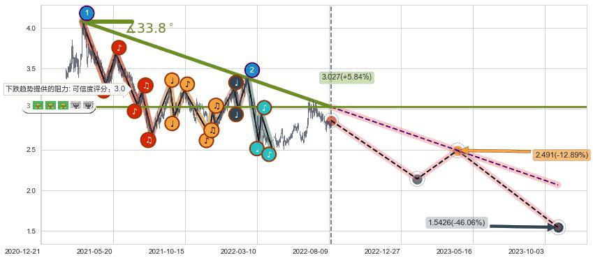 ♘ 在最后的下跌阶段2021-03-16至2022-04-20,存在 持续未破位的阻力位 ,阻力价格3.027,可信任强度74.81%,其距离最后价格2.860相差 +5.84%