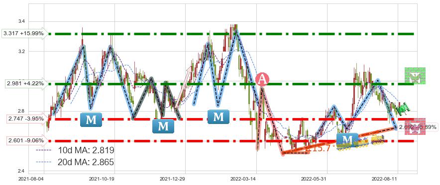♘ 支撑价格位2.747,可信任强度90.62%,距离最后交易2022-08-12形成的收盘价格2.860相差 -3.95%