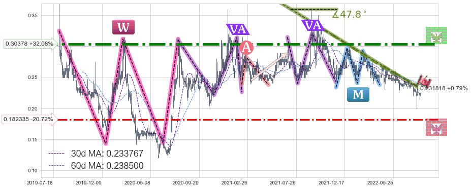 ♘ 阻力价格位0.30378,可信任强度92.46%,距离最后交易2022-08-12形成的收盘价格0.230000相差 +32.08%