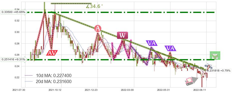 ♘ 阻力价格位0.33500,可信任强度94.49%,距离最后交易2022-08-12形成的收盘价格0.230000相差 +45.65%