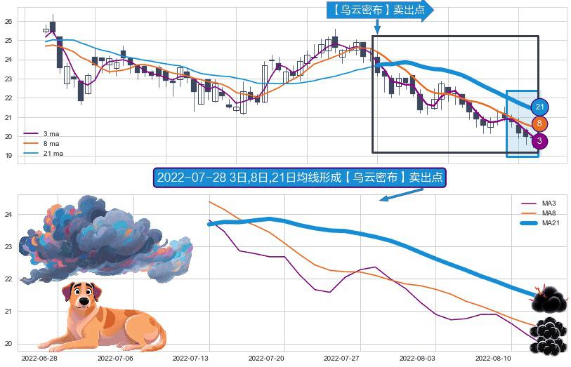 形态多维评估: ⚀ 2022-07-13日-2022-08-12日显现 3日-8日-21日均线 【乌云密布】卖出点 看空信号,后市看跌,卖出