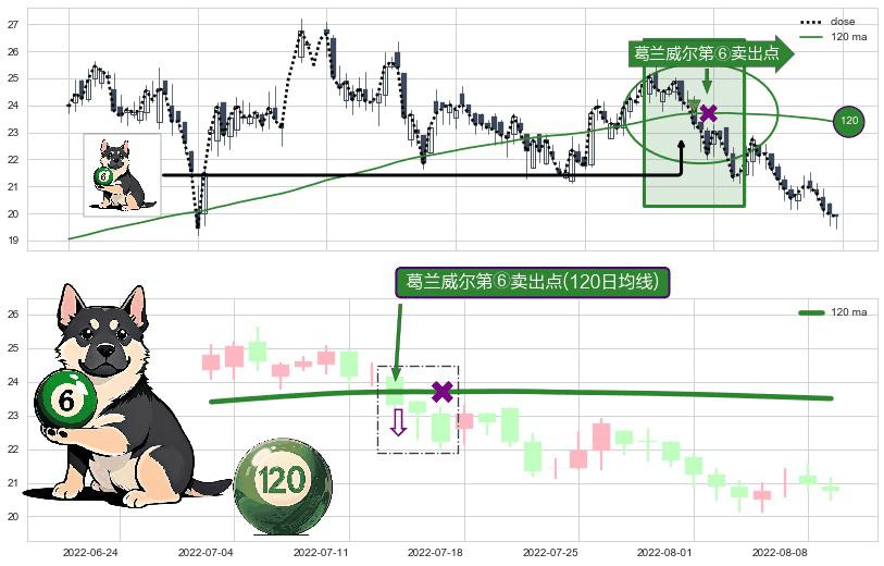 形态多维评估: ⚀ 2022-07-13-日显现 葛兰威尔均线 120日均线 第⑥卖出点 走势反转见顶信号,后市看跌,卖出信号