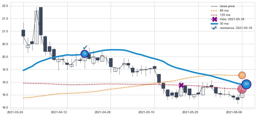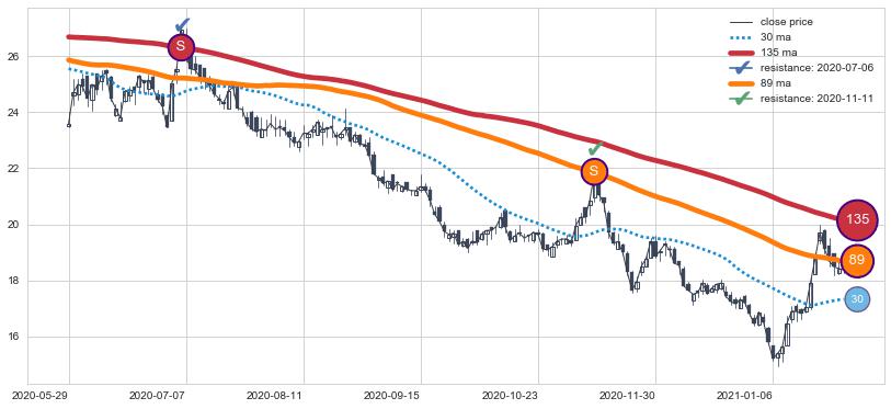 下跌趋势2020-05-29-2021-01-27,均线89, 135确认关键阻力2处