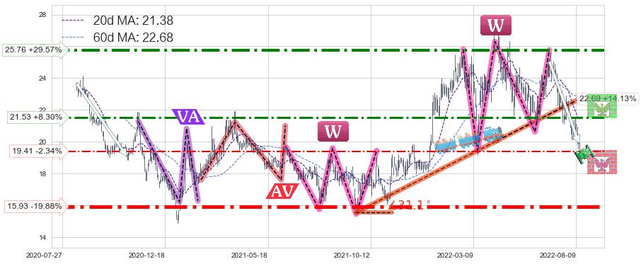 ♘ 支撑价格位19.41,可信任强度52.50%,距离最后交易2022-08-12形成的收盘价格19.88相差 -2.34%