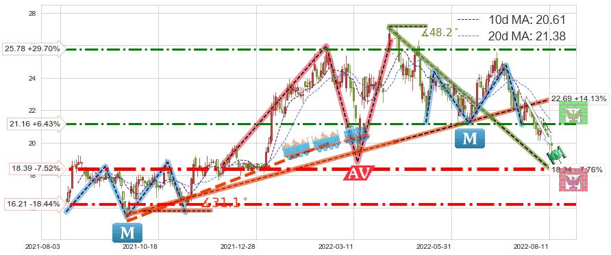 ♘ 阻力价格位21.16,可信任强度55.74%,距离最后交易2022-08-12形成的收盘价格19.88相差 +6.43%