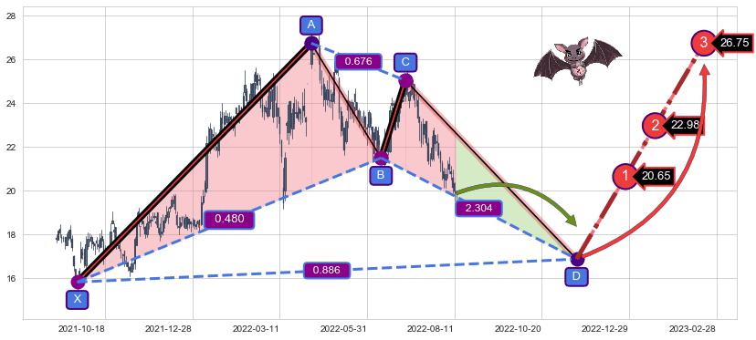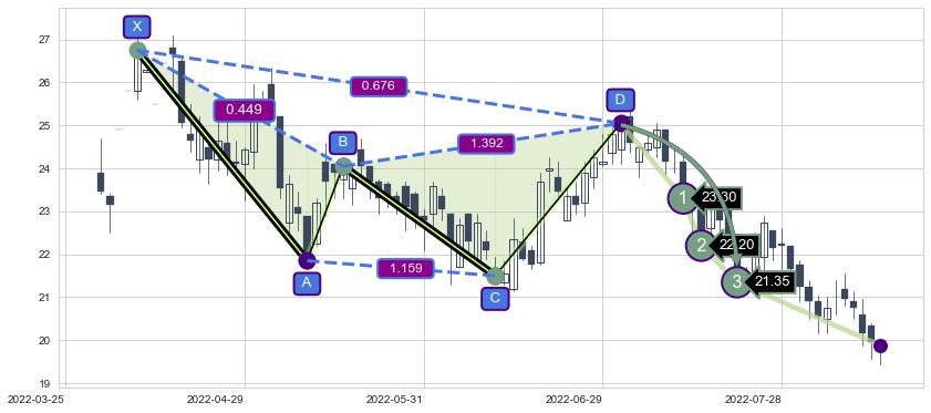➣ 未完成【蝙蝠】形态起点X: 2021-09-20, 已到达C点: 2022-07-04, 预测最终D点: 2022-11-17, 共287交易日