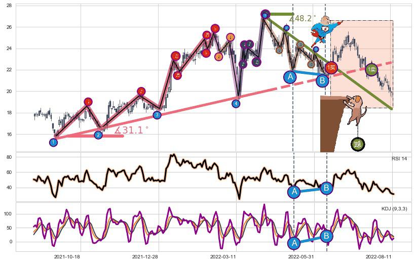 从2022-04-08至2022-06-30,共包含54个交易日,阶段股价下跌-5.48%,阶段股价变动位移路程比: 1 : 20,下跌趋势角度: 48.2