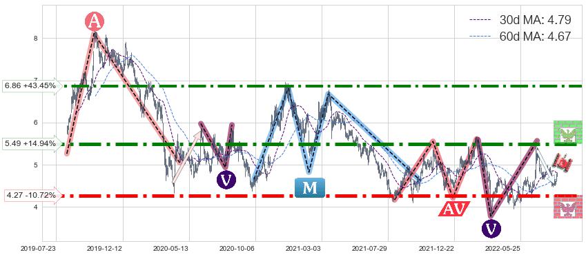 ♘ 阻力价格位6.86,可信任强度72.30%,距离最后交易2022-08-12形成的收盘价格4.78相差 +43.45%