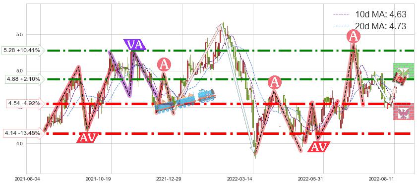 ♘ 阻力价格位4.88,可信任强度70.56%,距离最后交易2022-08-12形成的收盘价格4.78相差 +2.10%