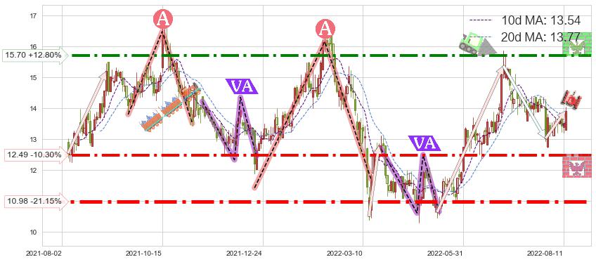 ♘ 支撑价格位10.98,可信任强度93.36%,距离最后交易2022-08-12形成的收盘价格13.92相差 -21.15%