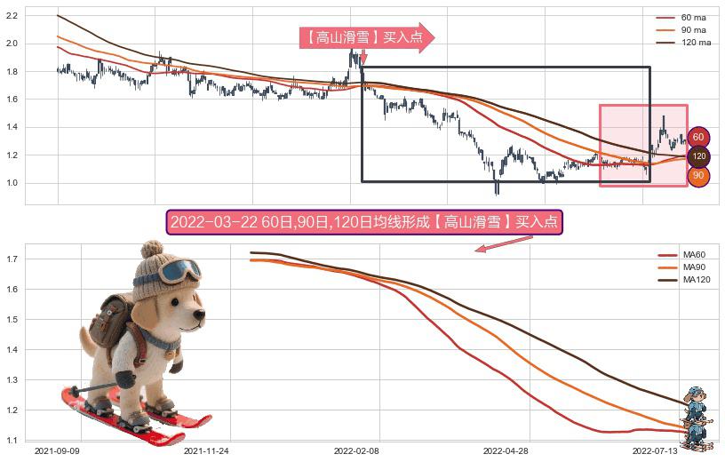 ⚀ 2021-12-03日-2022-07-18日显现 60日-90日-120日均线 【高山滑雪】买入点 看多信号,后市看涨,买入