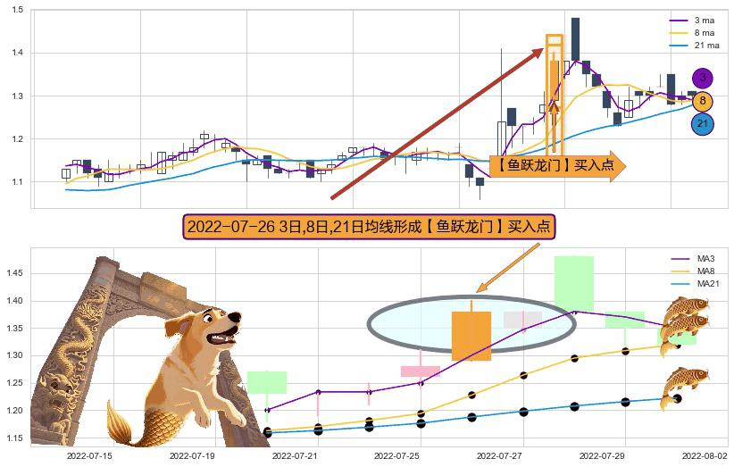 ⚀ 2022-07-26日显现 3日-8日-21日均线 【鱼跃龙门】买入点 看多信号,后市看涨,买入
