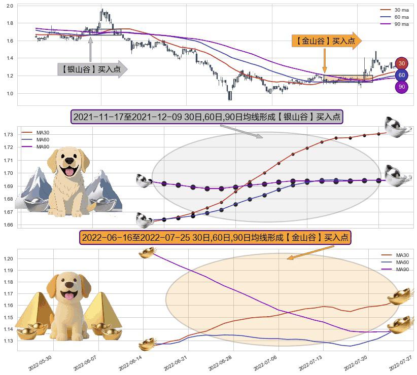 ⚃ 2022-06-17-日至2022-07-25-日显现 30日-60日-90日均线 【金山谷】买入点 其再次确认了买入信号,可靠性更强,买入