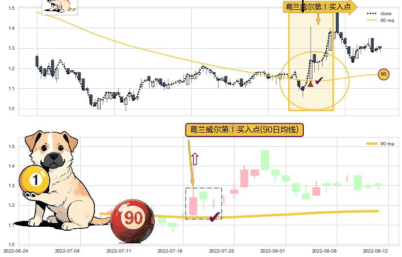 ⚀ 2022-07-19-日显现 葛兰威尔均线 90日均线 第买①入点 走势反转见底信号,后市看涨,买进信号