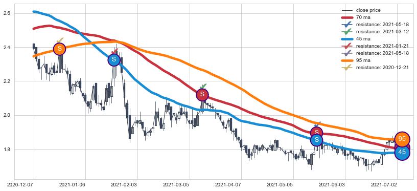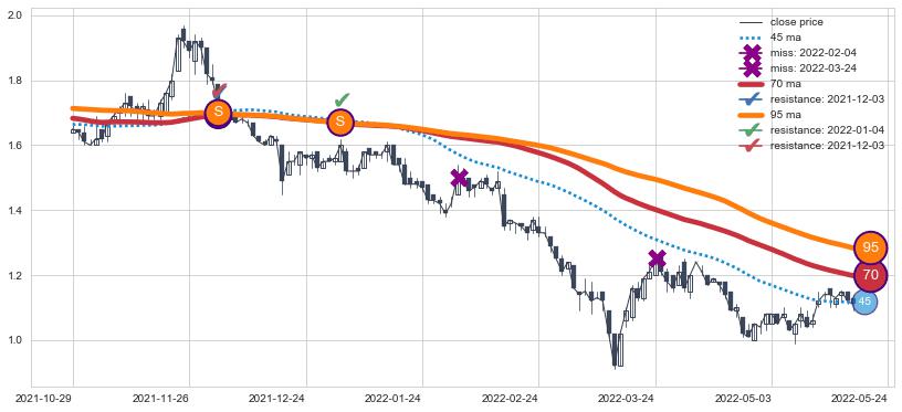 ⚄ 价格在均线遇到阻力后已再次向下回落了【较长】距离, 第⑦卖出点 阻力效果得到【初步确认】