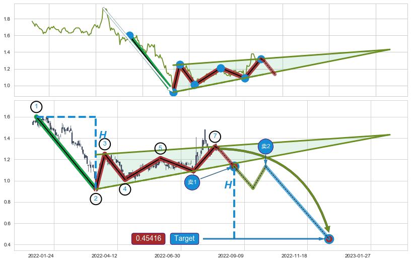 ➣ D点拟合预测价格1.5327,距离最后交易收盘价格1.3000相差 +17.90%