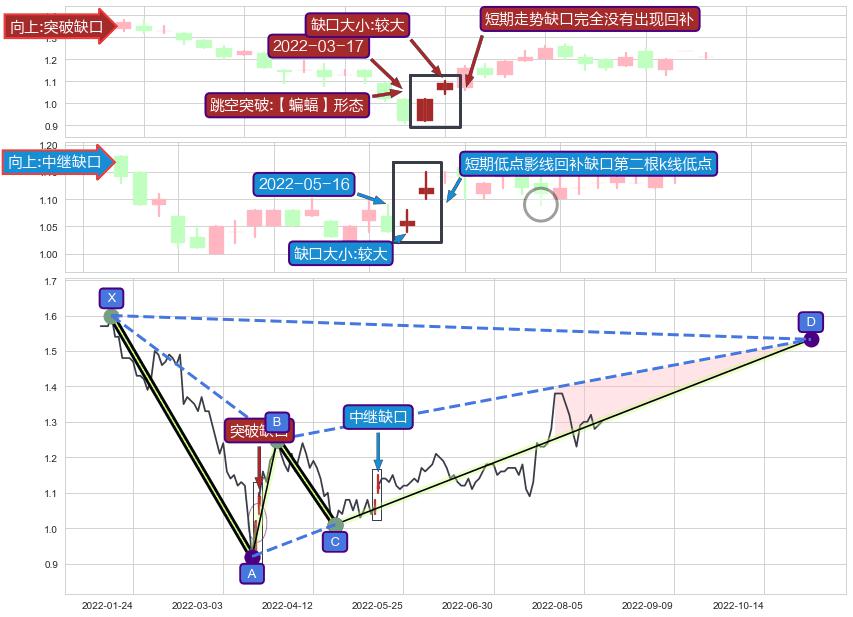 ➢ 跳空突破【蝙蝠】形态关键点后,后续非关键走势也无缺口回补迹象,突破缺口可信度提高