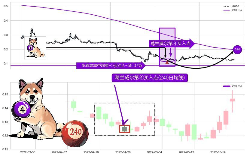 形态多维评估: ⚀ 2022-04-25-日显现 葛兰威尔均线 240日均线 第④买入点 下降趋势均值回复的短线反弹信号,后市看涨,买进信号